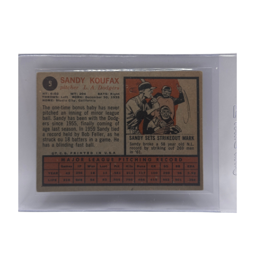 Own a piece of baseball history with this 1962 Topps Sandy Koufax #5 VG-EX card. With a VG-EX condition, it's a great addition to any sports card collection. This vintage card shows off your love for the game and one of its legendary players.