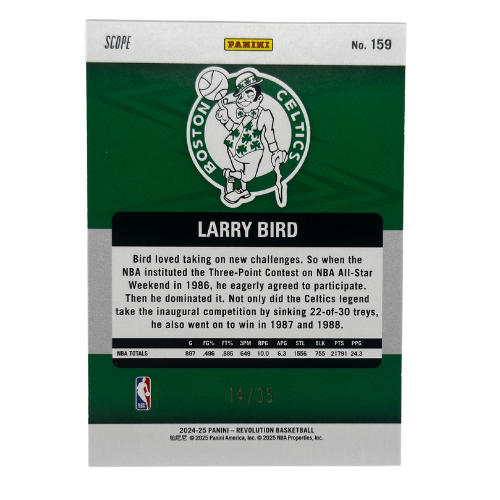 Upgrade your collection with the 2024-25 Panini Revolution Larry Bird Legends #159 /35 NM. This short print card showcases the Boston Celtics legend in Revolution’s bold design and is limited to just 35 copies. A rare and highly collectible piece for Celtics fans and NBA card collectors.