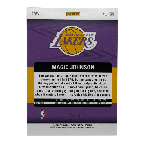 Add a legendary piece to your collection with the 2024-25 Panini Revolution Legends Magic Johnson #155 /35 NM. This limited-edition card celebrates the Lakers icon with Revolution’s vibrant design and is serial-numbered to just 35 copies, making it a rare must-have for NBA fans and collectors.
