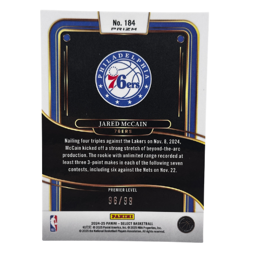 Boost your rookie card collection with the 2024-25 Panini Select Jared McCain RC Rookie Premier Level /99 NM. This limited-edition Premier Level parallel highlights the rising star in Select’s sleek design and is serial-numbered to just 99 copies, making it a must-have for NBA collectors and Duke fans.