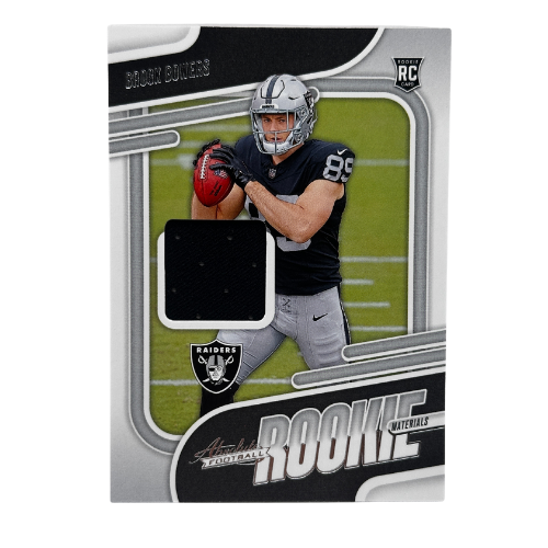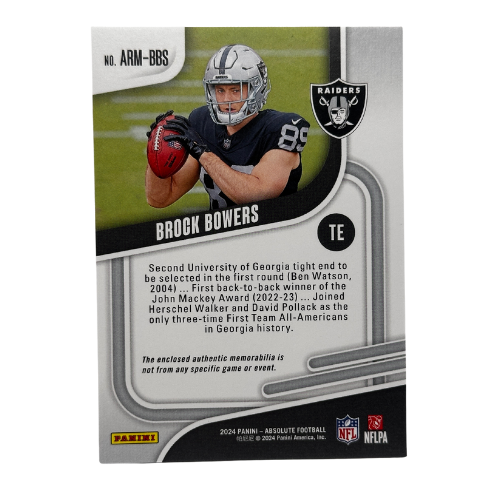 Enhance your football collection with the 2024 Panini Absolute Football Brock Bowers Rookie Materials #ARM-BBS NM. This rookie card features a jersey patch of the standout tight end, making it a must-have for collectors and fans looking to add a key rookie to their lineup.