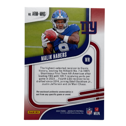 Enhance your collection with the 2024 Panini Absolute Football Malik Nabers #ARM-MNS Patch Rookie RC NM. This rookie card features a patch piece of the dynamic wide receiver, making it a standout collectible for football fans and a key addition for rookie card collectors.