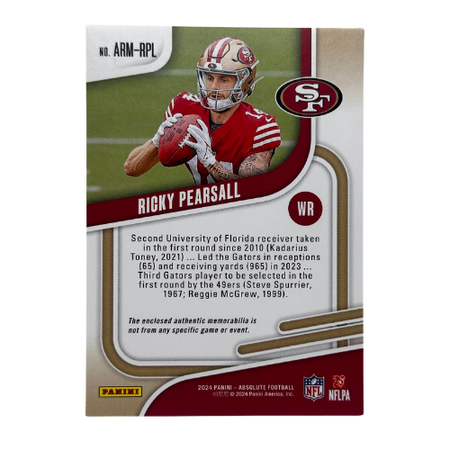 Add to your rookie collection with the 2024 Panini Absolute Rookie Materials Ricky Pearsall #ARM-RPL NM. This card features a jersey patch of the promising wide receiver, highlighted in Absolute’s clean design. A must-have collectible for football fans and rookie card collectors.