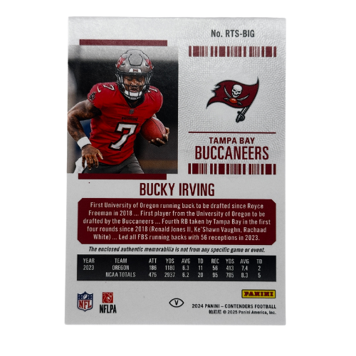 Add a promising rookie to your collection with the 2024 Panini Contenders Football Bucky Irving Rookie Ticket Jersey RC NM. Featuring the classic Rookie Ticket design and a jersey patch, this card is a standout collectible for football fans and rookie card collectors alike.