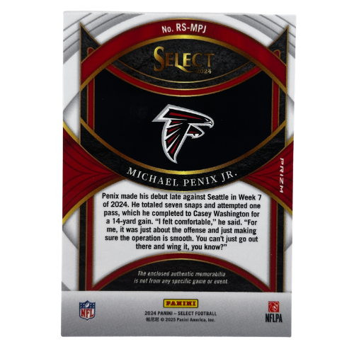 Add a standout rookie to your collection with this 2024 Panini Select Football “Rookie Swatches” Red Prizm card featuring Michael Penix Jr. This premium rookie card includes a swatch material and the eye-catching Red Prizm parallel finish, making it a must-have for collectors and fans of the exciting young quarterback.