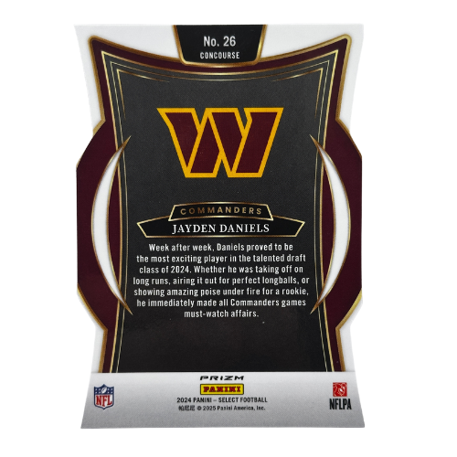 Elevate your football card collection with the 2024 Panini Select RC Jayden Daniels Silver Concourse Die Cut #26 NM. This limited-edition rookie card features a sleek silver die-cut design, highlighting Daniels’ dynamic play and making it a must-have for collectors and fans alike.