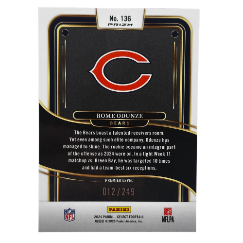 Enhance your NBA collection with the 2024 Panini Select Rome Odunze Select RC #136 /249 NM. This limited-edition rookie card features the rising star in Select’s premium design and is serial-numbered to 249 copies, making it a must-have for collectors and fans of Rome Odunze.