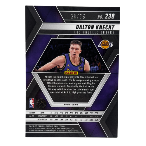 Chase one of the most exciting rookies of the 2024-25 NBA season with this Dalton Knecht Blue Fluorescent Rookie Card, serial numbered to just 75 copies. Part of the popular Panini Mosaic Basketball set, this limited-edition parallel features vibrant blue fluorescent coloring and premium Mosaic finish, making it a standout piece for collectors and investors alike.