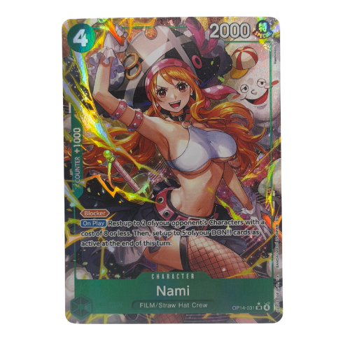 This listing features Nami Alternate Art OP14-031 from the Bandai One Piece Card Game, offered in Near Mint (NM) condition. As one of the most iconic characters in One Piece, Nami’s Alternate Art cards are highly sought after for their unique artwork and strong collector demand.
