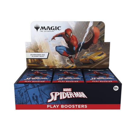 Gather web-slingers from across the Spider-Verse and team up to take down the sinister foes that threaten the city. This Magic: The Gathering | Marvel's Spider-Man Play Booster Box contains 30 Play Boosters, perfect for both playing with friends and opening packs just for fun. Each Play Booster contains 14 Magic: The Gathering cards and 1 Token, including 1-4 cards of rarity Rare or higher and 3-5 Uncommon, 6-9 Common, and 1 Land cards. One card of any rarity is Traditional Foil. The Land card is also Traditional Foil in 20% of boosters.