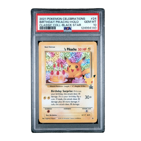 Add a nostalgic favorite to your collection with the Pokémon TCG: 2021 Celebrations Birthday Pikachu Holo #24 PSA 10. This gem-mint graded card features the beloved Birthday Pikachu in stunning holographic detail, honoring one of the most iconic promo designs in Pokémon history. Perfect for collectors and investors alike.