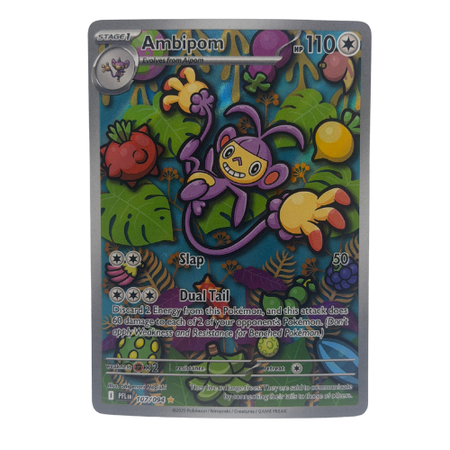 This Ambipom Holo card is from the ME02: Phantasmal Flames expansion and features lively full-art artwork showcasing Ambipom in a dynamic pose. Holo Illustration Rares from this set are highly collectible for their vibrant colors and detailed illustrations.