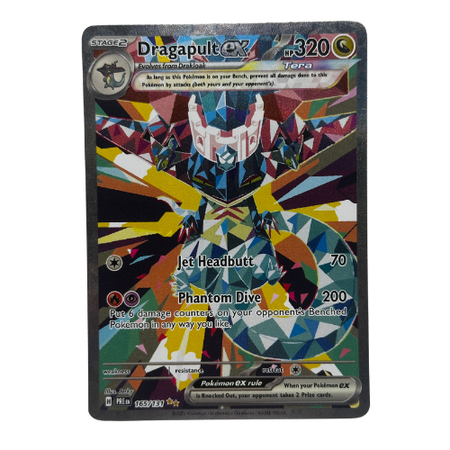 Unleash ghostly speed and power with this Dragapult EX Special Illustration Rare from the Pokémon TCG: Prismatic Evolutions expansion. Featuring breathtaking full-art artwork and vibrant detailing, this rare card is numbered 165/131, making it a sought-after chase card for competitive players and collectors alike.
